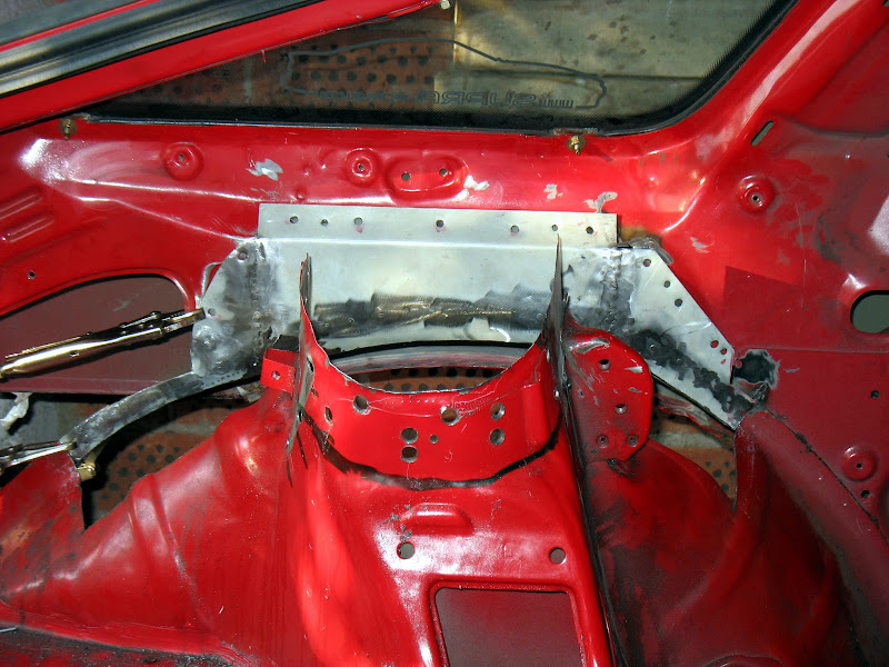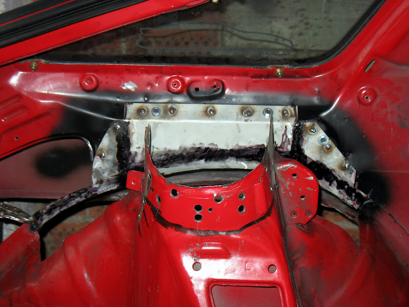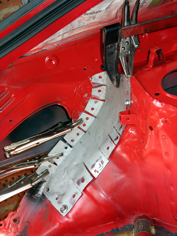 - Deckel ist wieder drauf. Mußte einige Anpassungen vornehmen, da das Blech, daß vorher dazwischen war, fast doppelt so dick wie das war, das ich jetzt eingesetzt hab (und trotzdem isses weggegammelt. Dickes Blech ist also auch kein Allheilmittel). Zudem hab ich ja hier und da noch was weggeschliffen, deswegen fehlte am Ende ca. 1mm zwischen Wand und Deckel. Das hab ich dann mit nem entsprechend Dicken Flachstahl ausgeglichen. Hab vorher die Position des Deckels korrekt ermittelt. Unter der Zierleiste vom Dachhimmel an der Heckklappe ist eine Einkerbung. Das ist der Mittelpunkt der Karrosse. Es muß also alles beidseitig gleich weit davon entfernt sein. Also rechts gemessen udn links entsprechend positioniert. Flachstahl erst am den Deckel geschweißt, dann komplett durchgebohrt und durch diese Bohrungen mit ordentlich Strom und Draht an die Seitenwand gebrutzelt. DAS sollte halten. Getestet wird's mit Zementsäcken im Kofferraum und nem verranzten Feldweg mit 80 Km/h. :D - Eine Seite vom Dom ist fertig, heute kommt die nächste. Bilder von gerade eben: Wie gehabt angepunktet, verschliffen, gesäubert, Rostumwandler, Grundierung und bissel Lack aus der Dose (gab's grad günstig beim Discounter). Bilder vom Anpassen: Zitat: