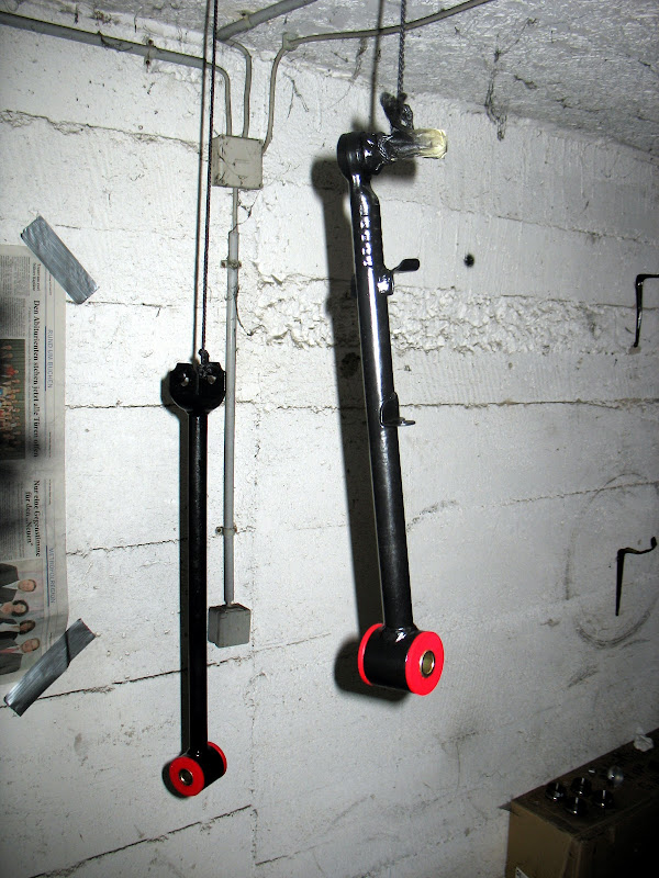 Heute hab ich ein bissel die Lackierpistole geschwungen und noch paar Teile mit Brantho Korrux gesprüht. Zweite Seite vom Rahmen Die sind richtig gut geworden. Hab ich vorher mit der Drahtbürste entrostet und mit Fertan behandelt. Bohrungen werden am Schluß wieder gesäubert und Gewinde nachgeschnitten. Der Rest. Untere Querlenker haben jetzt die zweite Schicht Farbe, da können die Buchsen rein, sobald das trocken ist. BK hat leider den Nachteil, daß es lange zum Trocknen braucht. Und man sollte die vorherige Schicht unbedingt vollständig austrocknen lassen, bevor man eine weitere Schicht spritzt. Sonst kann's passieren, daß die oberste aushärtet, aber die untere noch weich ist. Dann hält's nicht besonders. Deswegen sollte man da mindestens 24 Stunden zwischendrin warten. Je länger, desto besser. |